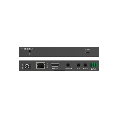 Inputs: 1x HDBT IN [RJ45, 8-pin female] 1 x SERVICE [Mini-USB , Update port] Outputs : 1 x HDMI Type A [19-pin female] 1 x AUDIO OUT [3.5mm Stereo Mini-jack] Control : 1 x IR IN [3.5mm stereo Mini-jack] 1 x IR OUT [3.5mm Stereo Mini-jack] 1 x RS-232 [Phoenix jack ] |